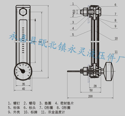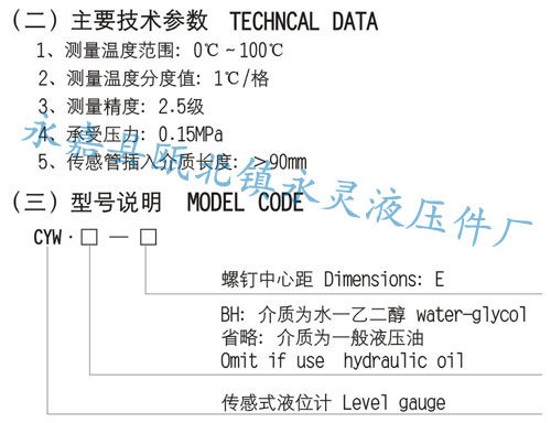 我厂按国家G81161—90新标准生产的YWZ系列液位温计是油箱,润滑装置,冷却箱和齿轮传动箱上的必备附件,它可指示液位及液温的高低。本产品具有设计新颖,美观,液位和液温显示清楚,富有立体感等特点,它具有装配性能优越,坚固、防裂、防震、防漏等优点。该产品根据油箱容量,设计成25种不同的规格。产品实行三包,欢迎广大用户选用。